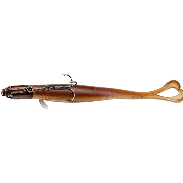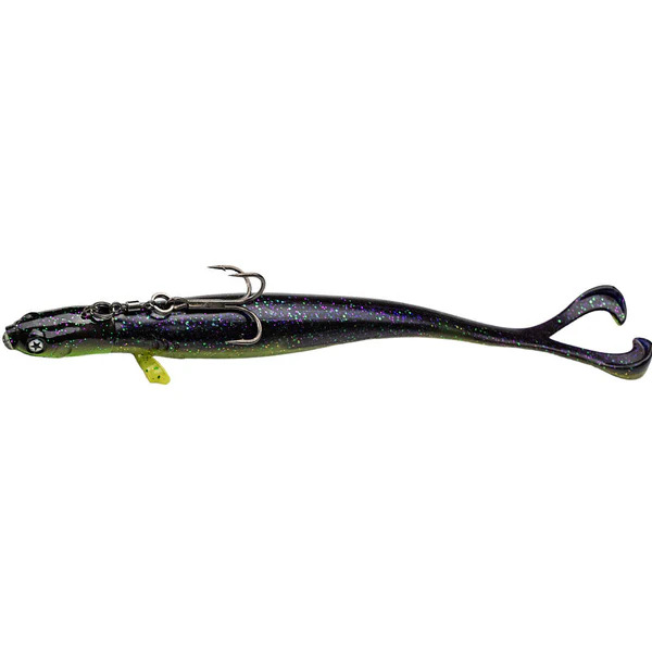Der LMAB Drunk Shooter ist eine ideale Kombination für das pelagische Angeln, bestehend aus einem speziell geformten Kopf und einem äußerst fängigen Softbait. Der 55 g schwere Kopf ist spitz zulaufend und aquadynamisch gestaltet, sodass er schnell sinkt und in der gewünschten Tiefe perfekt waagerecht im Wasser bleibt. Diese Eigenschaften sind beim Pelagen oft fangentscheidend. Der Köder wird mit einer 2 cm langen Schraubspirale fixiert, die ihn fest im Softbait hält. Auffällige Sternaugen im Drunk Bait Design mit Prismenoptik sorgen für zusätzliche visuelle Reize. Ein teflonbeschichteter Spezialdrilling der Größe 1/0 ist mit 2 Pins ausgestattet, die ihn optimal im Softbait fixieren und alle 3 Hakenspitzen frei halten, um eine hohe Bissausbeute zu gewährleisten. Der Softbait ist 23 cm lang, zusammen mit dem Kopf ergibt sich eine Gesamtlänge von 25 cm. Er verfügt über 2 lang abstehende Brustflossen und eine lang abstehende Afterflosse, die für Mikrovibrationen sorgen. Der Heart Tail bietet je nach Führungsstil verschiedene Aktionen: No Action im Stillstand, Low Action bei leichtem Zug und High Action bei starkem Zug. Bei starkem Zug explodiert der Heart Tail regelrecht und erzeugt eine intensive, entgegengesetzte Paddelaktion.