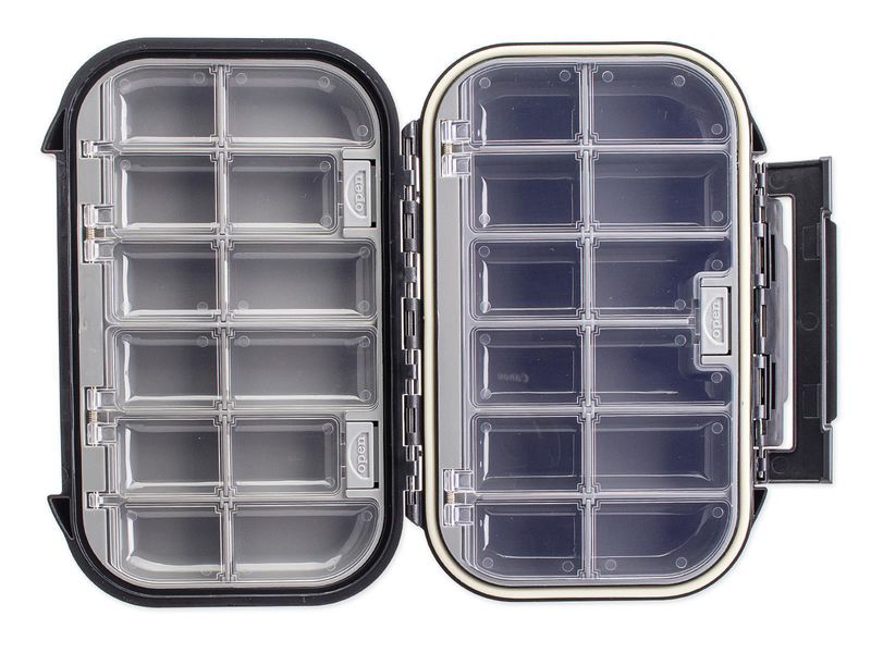 In der CAMO Lures Tackle Box TBX-200 finden alle Kleinteile wie Wirbel, Karabiner, Strengringe, usw. Platz. Mit 24 Fächern, die in der Mitte durch eine herausnehmbare Trennwand unterteilt sind, kann man die Fächer vergrößern. Die Box ist aus festem Kunststoff hergestellt und verfügt über eine einhändig bedienbare Schließe. Eine Gummidichtung verhindert das Eindringen von Wasser. Ein Federmechanismus öffnet die Box Kinderleicht im Innenraum. Aus dieser Box kommt kein Zubehörteil raus und durch die Abgerundeten Ecken ist die Entnahme einfach.