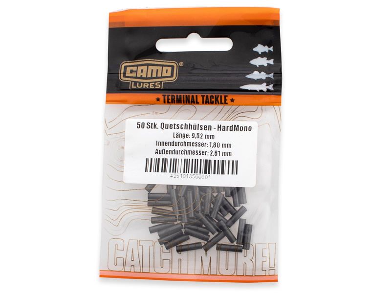 Die CAMO Quetschhülsen sind extra für Hardmono gefertigt, für das perfekte verarbeiten von Hardmonovorfächern. Der optimale Schnurdurchmesser für die Quetschhülsen ist 0,65 mm bis 0,90 mm.