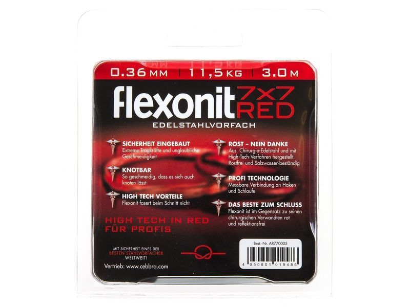 Das Stahlvorfach ist aus 49 einzelnen Fäden hergestellt. Es fasert nicht aus, ist Knotbar, salzwasserbeständig und rostfrei. Es ist stark abriebfest und reflektiert nicht. Die Farbe Rot ist unter Wasser sehr schwer wahrnehmbar für den Fisch.