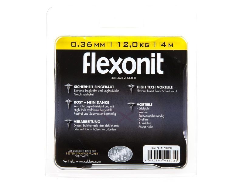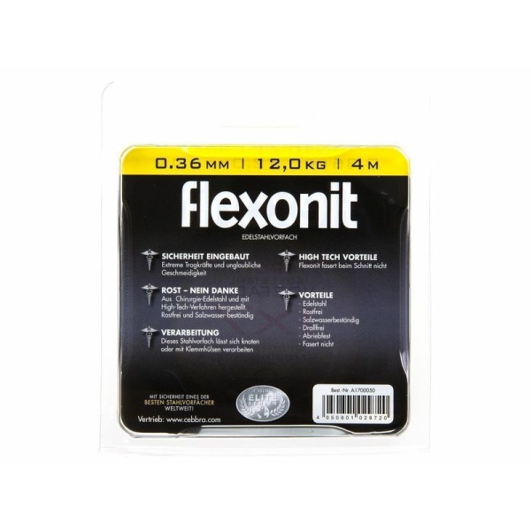Dieses Stahlvorfach ist aus 7 einzelnen Fäden hergestellt. Es Fasert nicht aus, ist rostfrei, salzwasserbeständig und es ist Knotbar. Es ist abriebfest und seine Oberfläche reflektiert nicht. Einsetzbar ist das Flexonit 1X7 als Vorfach oder für den Bau von Stingern.